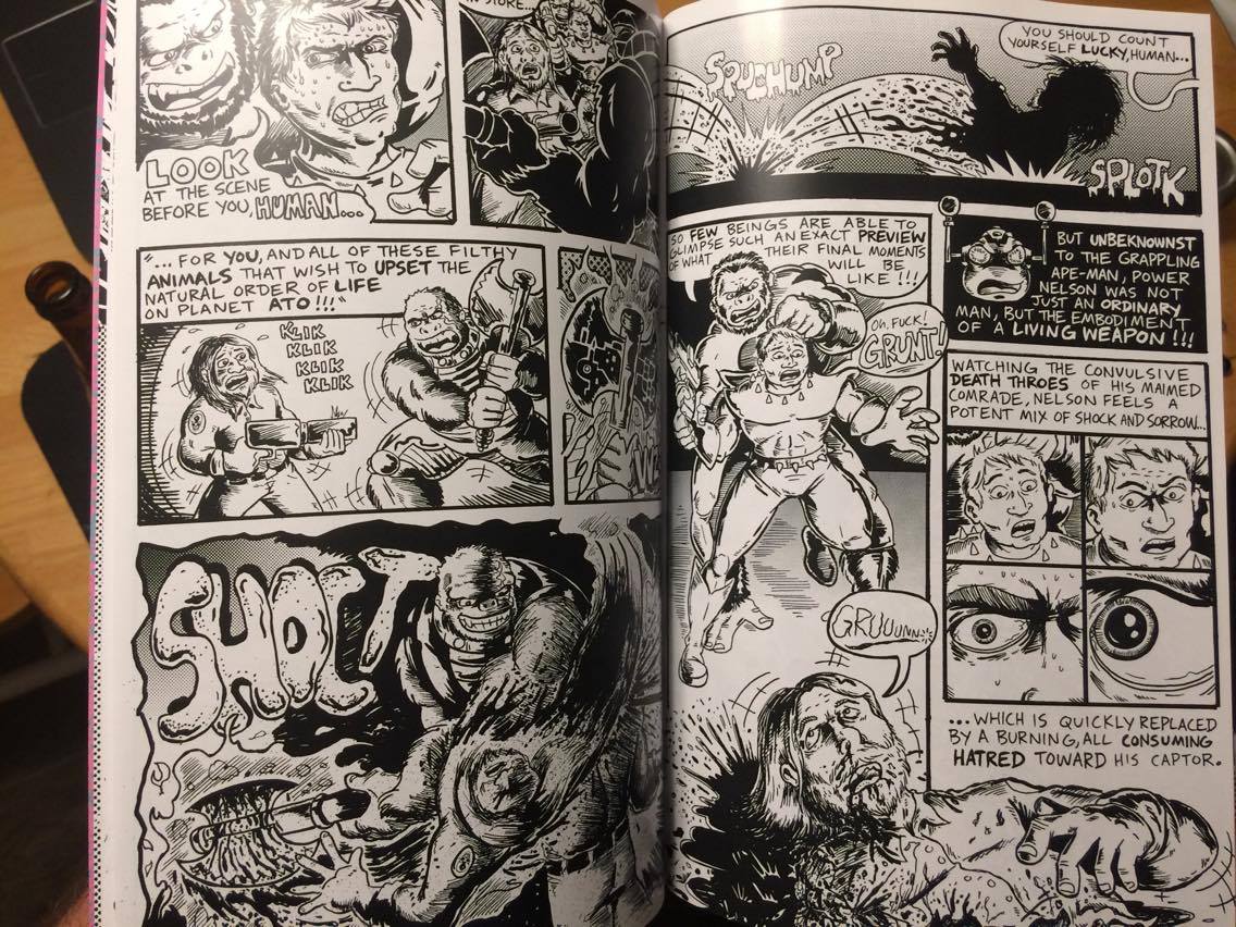 "Ape-Men of the Apocalypse" #1 is a 44-pg, saddle-stitched, B&W indie comic created in the spirit of those produced during the 1980s! It's a weird and violent sci-fi action comic, full of Kirby-Krackle, fisticuffs, and curse words.