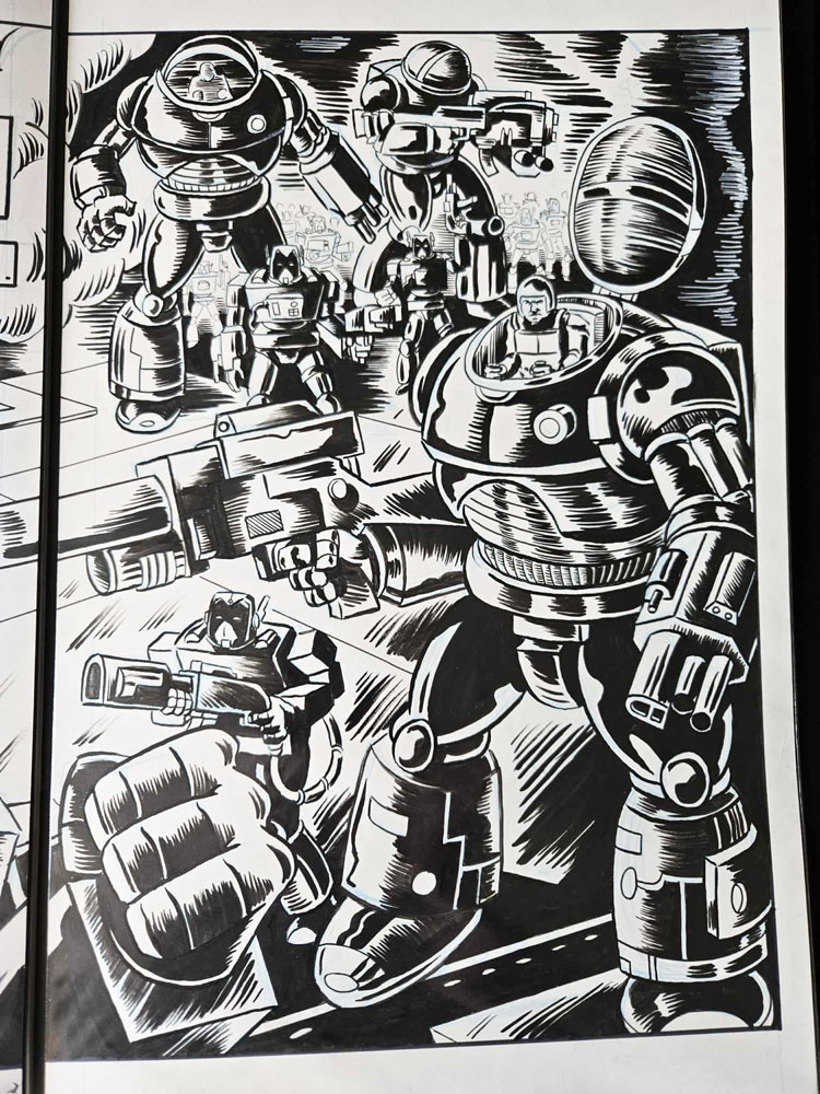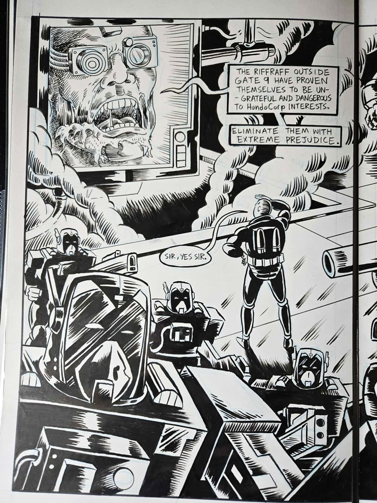 Double-page spread published in the independent comic magazine, TECH NOIR (published by HUNDO Industries). Pen, blue pencil and ink on11x22 Bristol (split in half).