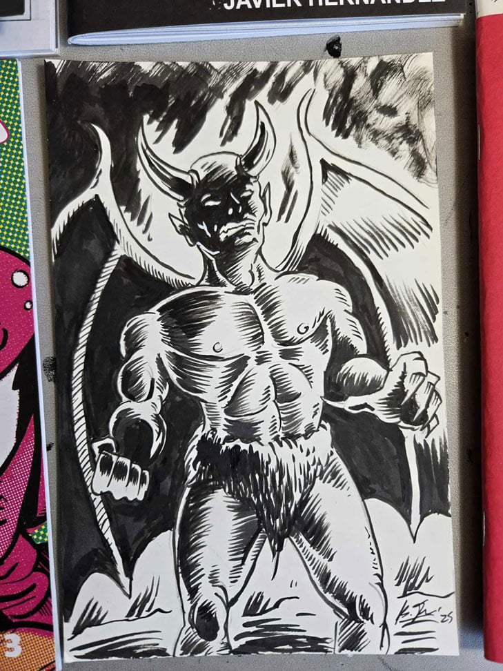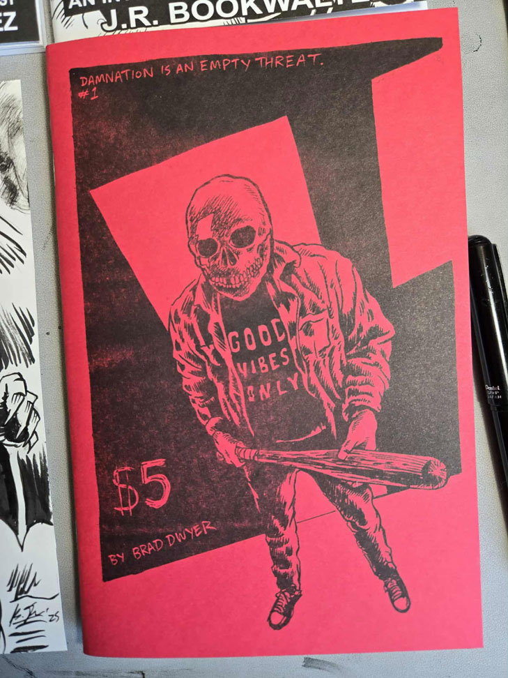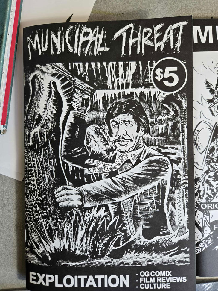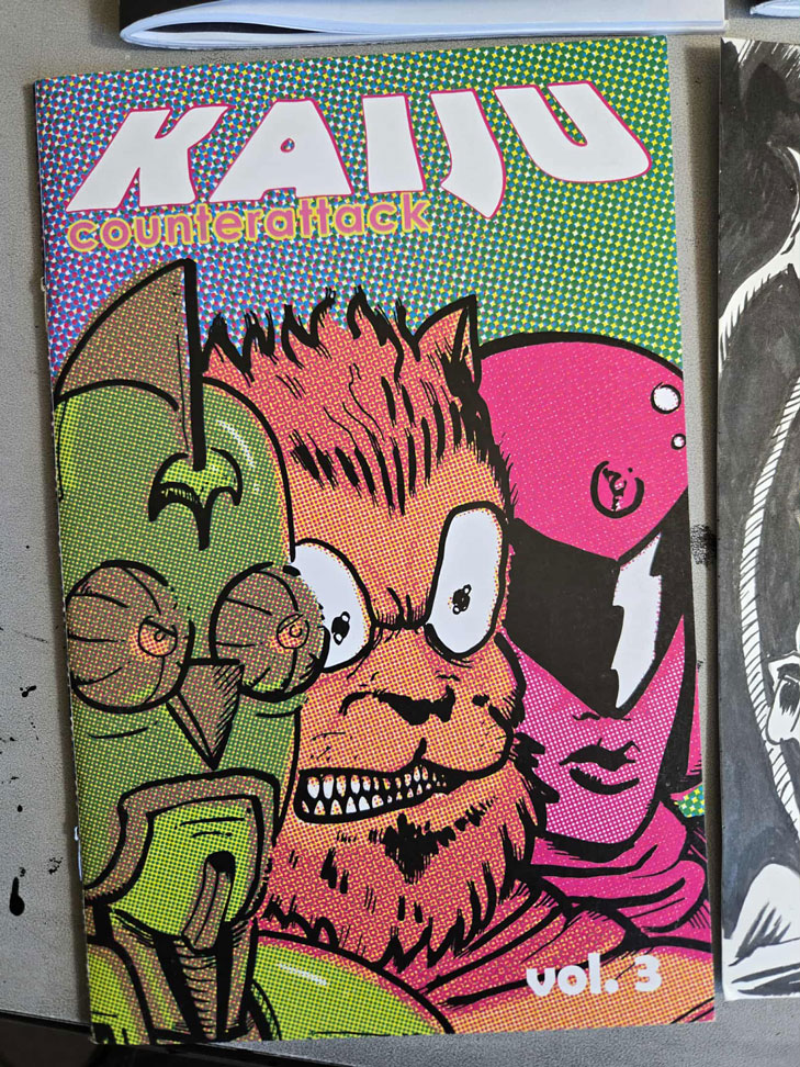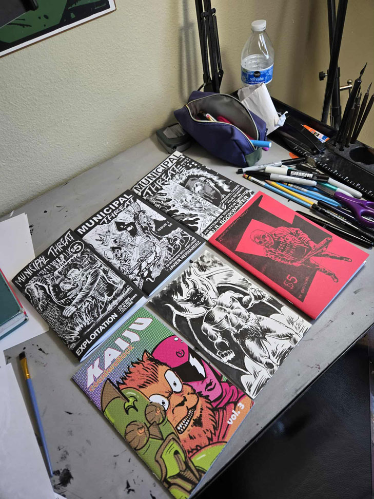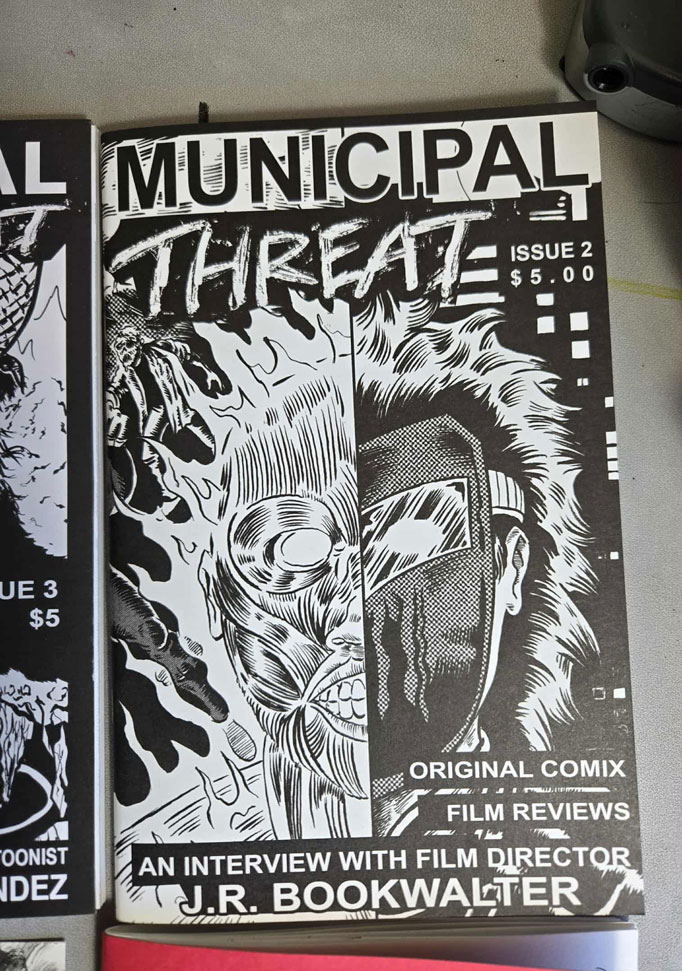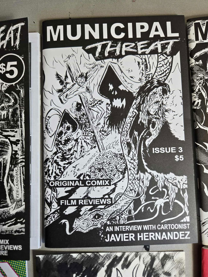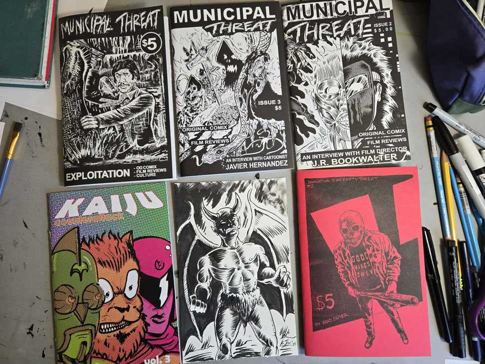 For the month of October '25, a value zine pack of MUNICIPAL THREAT #1-3, DAMNATION IS AN EMPTY THREAT #1, KAIJU COUNTERATTACK #3, and a zine-sized piece of Halloween/Satanic piece of original art! Get it while supplies last!